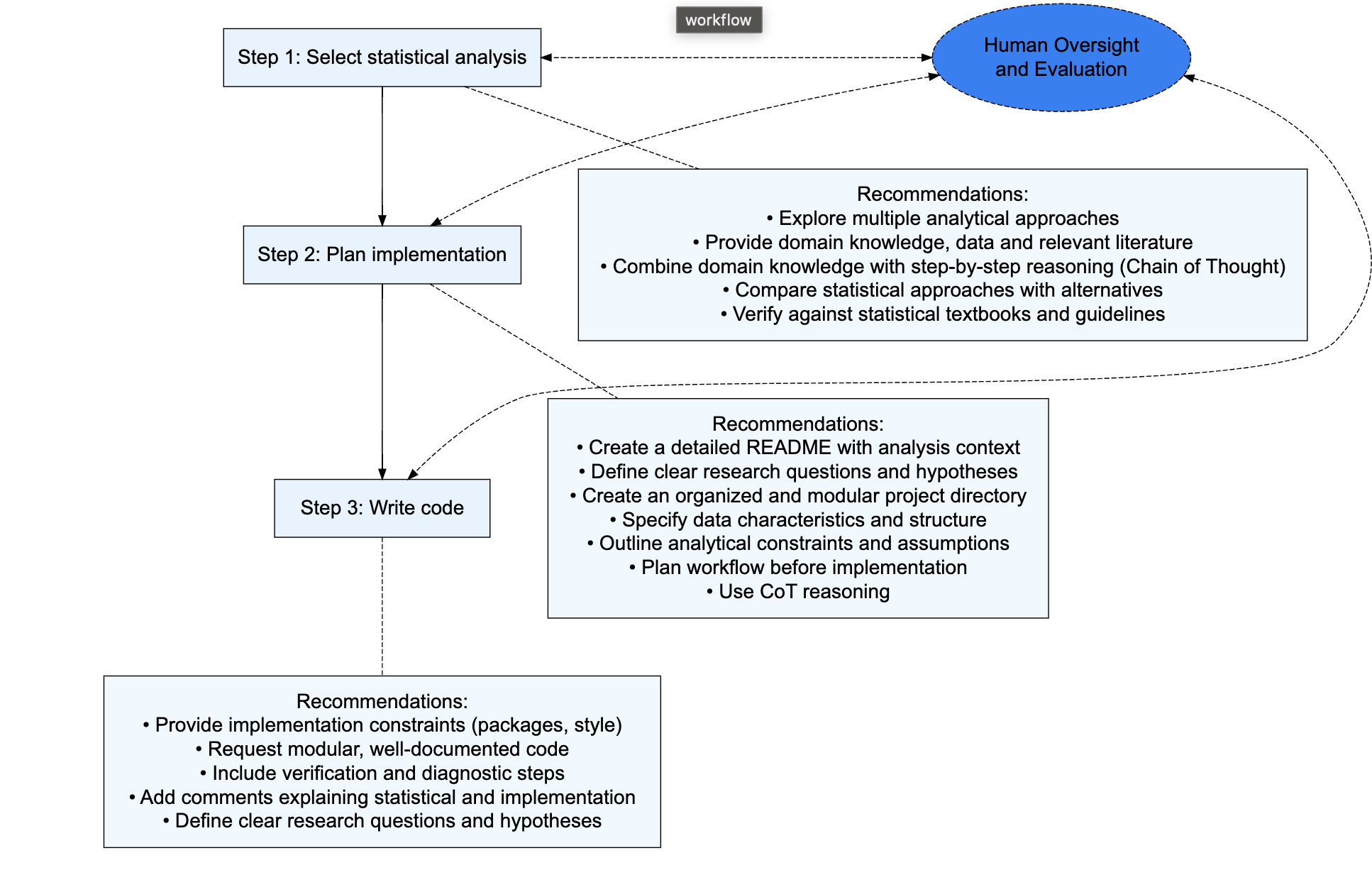 The separation of workflow steps also helps prevent overreliance on LLMs for statistical decisions.