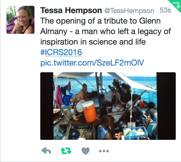 Many people were touched and inspired by a memorial session on reef fish ecology held in honour of Dr Glenn Almany. I only met Glenn a few times, but the science he did has influenced my work and he has left a lasting legacy for coral reef science and conservation. Source: http://twitter.com