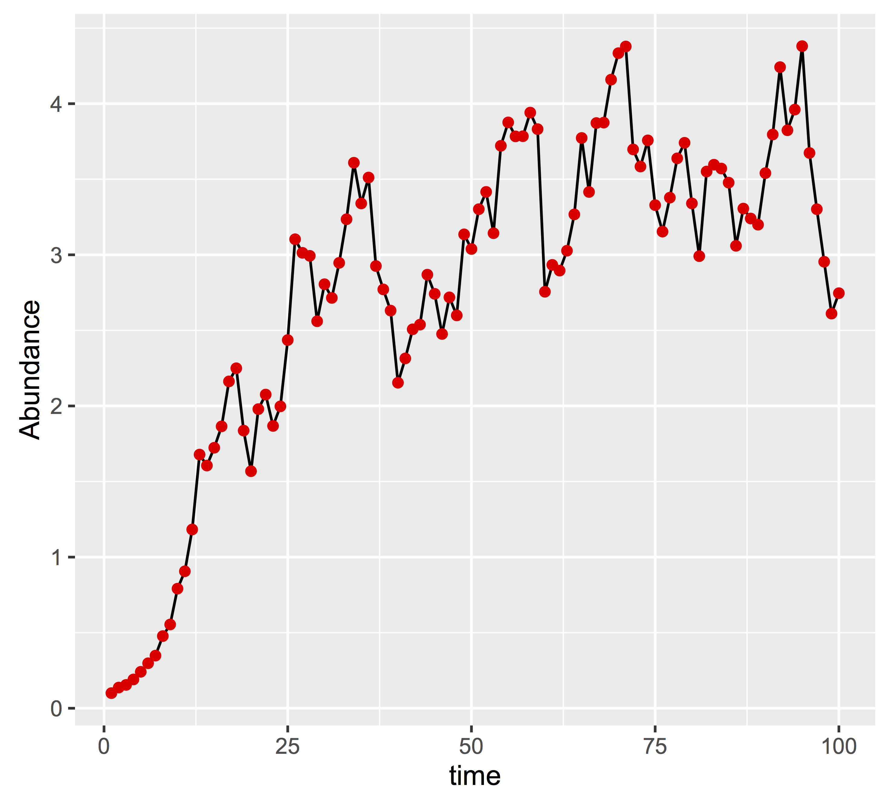 The model we will use to test purrr will create stochastic simulations of population size that look something like is pictured.