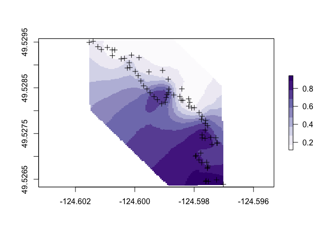 Note that here we choose alpha = 2. alpha is a smoothness parameter that must be 0 <= alpha <= 2, higher values will give smoother spatial interpolation. Also note that we have to specify ‘data’ for the intercept (just a vector of 1).