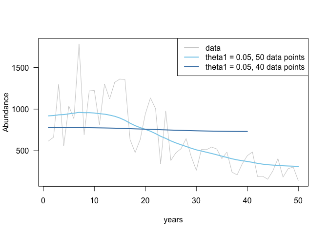 legend('topright', legend = c("data", "theta1 = 0.05, 50 data points", "theta1 = 0.05, 40 data points"),