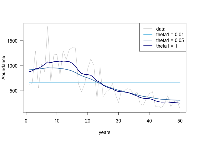 legend('topright', legend = c("data", "theta1 = 0.01", "theta1 = 0.05", "theta1 = 1"),