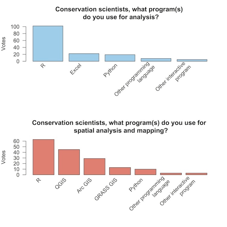 The R program tops the list of most popular analysis programs. Not a surprising result, given its predominance in the biological, ecological and social sciences that conservation science draws from.