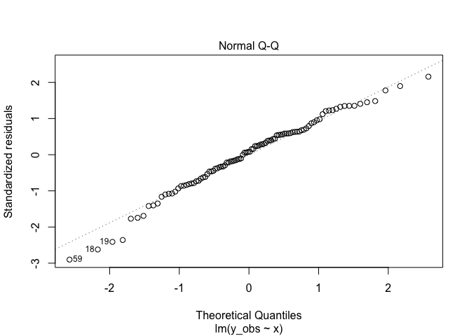 This command tells us the estimate of the intercept ((Intercept)) and the slope on x under x. Notice they are close to, but not exactly the same as alpha and beta. So the model has done a pretty decent job of recovering our original process. The reason the values are not identical is that we simulated someone going and measuring the real process with error (that was when we added the normal random numbers).