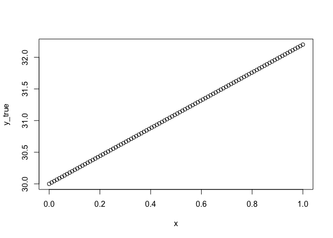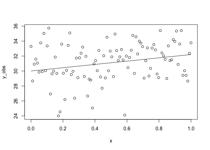 Here sigma is our standard deviation, which measures how much the observations y vary around the true relationship. We then used rnorm to generate n random normal numbers, that we just add to our predicted line y_true to simulate observing this relationship.