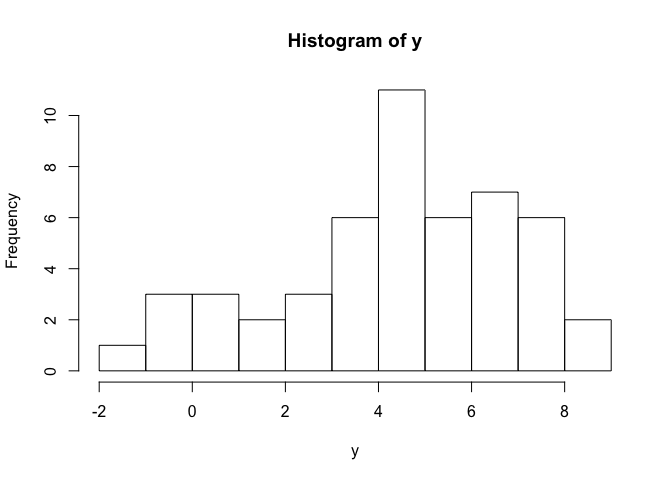 The estimate of the mean is stored here coef(m1) =4.38, the estimated variance here sm1$dispersion= 5.91, or the SD sqrt(sm1$dispersion) =2.43. Just to be totally clear, we also specified that we believe the data follow a normal (AKA “Gaussian”) distribution.