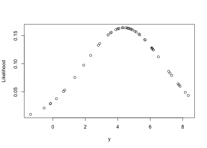 plot(y, dnorm(y, mean = coef(m1), sd = sdest), ylab = "Likelihood")