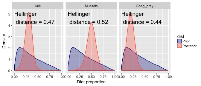 In the above picture you see the Hellinger distance for each posterior. This measures the divergence between prior and posterior, with values near zero indicating identical distributions and values near one indicating the posterior has positive probability everywhere the prior had zero probability (ie maximal divergence).