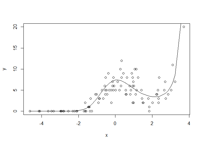 First, let’s make up a bit of count data. The underlying ‘true’ model will be poisson (think count data) with a log link (so slope estimates are multiplicative of the poisson mean). But we’ll introduce a bit of non-linearity.