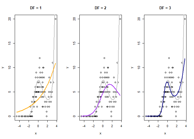 The orange line is the naive linear fit, it basically shows no trend. The purple line (df = 2) does better, but misses the kick up at the end. The blue line looks closest to the ‘true’ mean function (grey line).