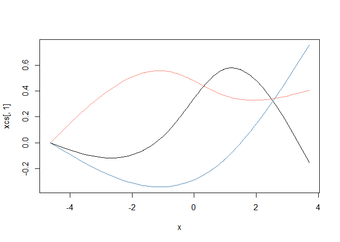 This splits x into three covariates (note the new matrix xcs has three columns), which I’ve plotted above. The cubic spline algorithm puts bends in the new covariates according to the density of the data.