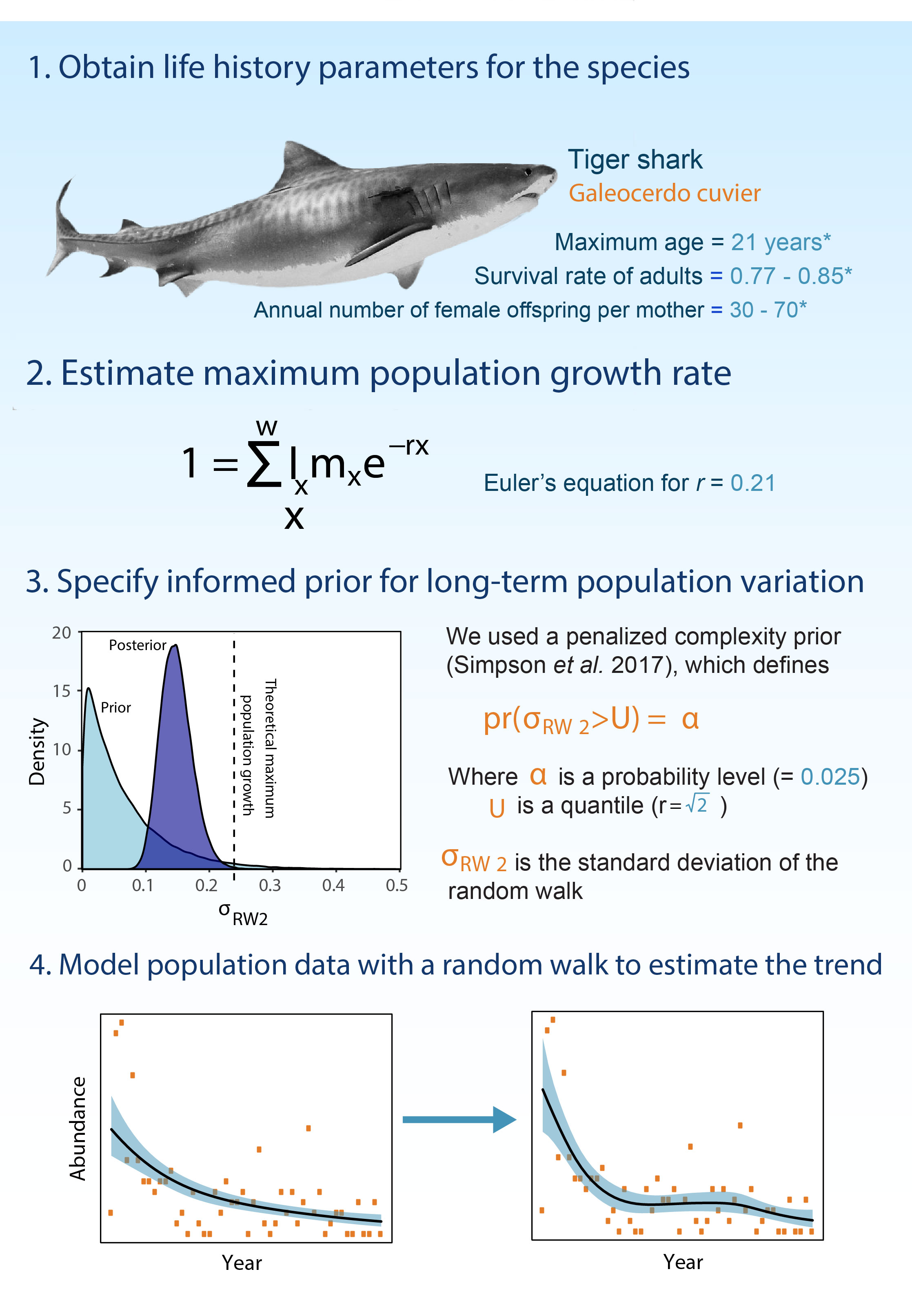 We show that the random walk variance can be informed by life-history information (see picture). These are measurements scientists have made of tiger sharks, which do not depend on time-series. For instance, information like, at what age do tiger sharks breed and how many babies do they have?