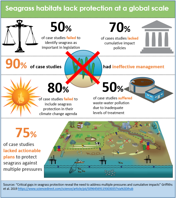 Seagrass ecosystems face multiple threats, from pollution to sea level rise. However, management is failing to adequately protect these ecosystems and prevent their decline. We reviewed global policy relevant to seagrass protection and identified some critical gaps. We need to rethink how we protect coastal ecosystems in general, and seagrasses in particular, from multiple cumulative threats.