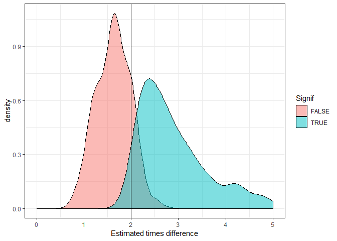 So average effect size for the significant trials is >3x (remember the real difference is 2x). If we take the average across all trials it is closer to the truth (2.3x).