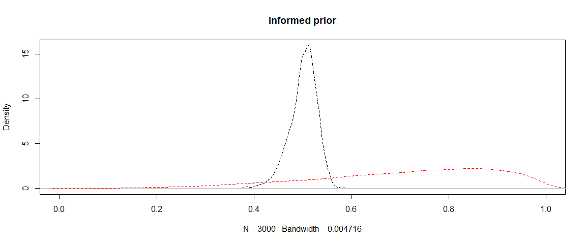plot(density(p_post_inf[,1]), lty = 2, main = "informed prior", xlim = c(0,1))
