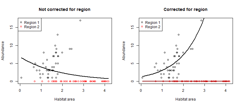 Habitat is significant (p < 0.001), but the estimate is in the wrong direction! It is saying there are fewer fish with more habitat. This is because the second region has on average twice as much habitat, but our fish doesn’t ever occur there.