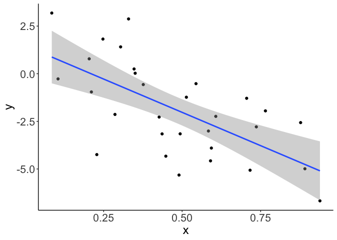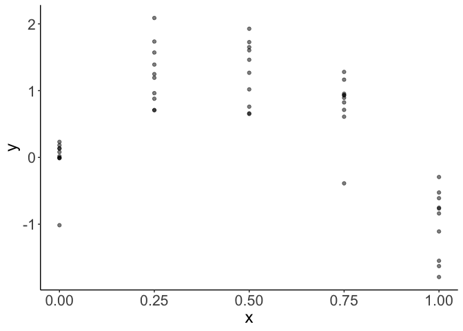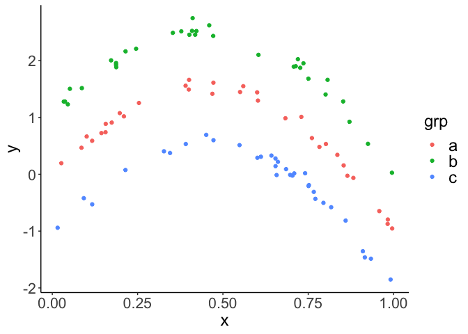 First generate some data. We’ll simulate some data y that is related to x via a polynomial (hump shaped) function. Then there will be three groups in variable grp. Each group has a different mean, which will just offset the three groups on the y-axis from each other. See plot below: