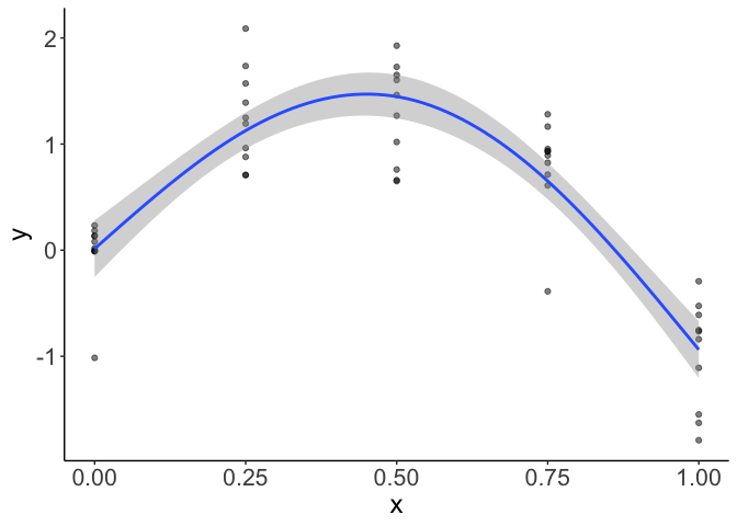 dat$y <- with(dat, 7*x -8*x^2 + cat_effect + rnorm(n, sd = 0.1))