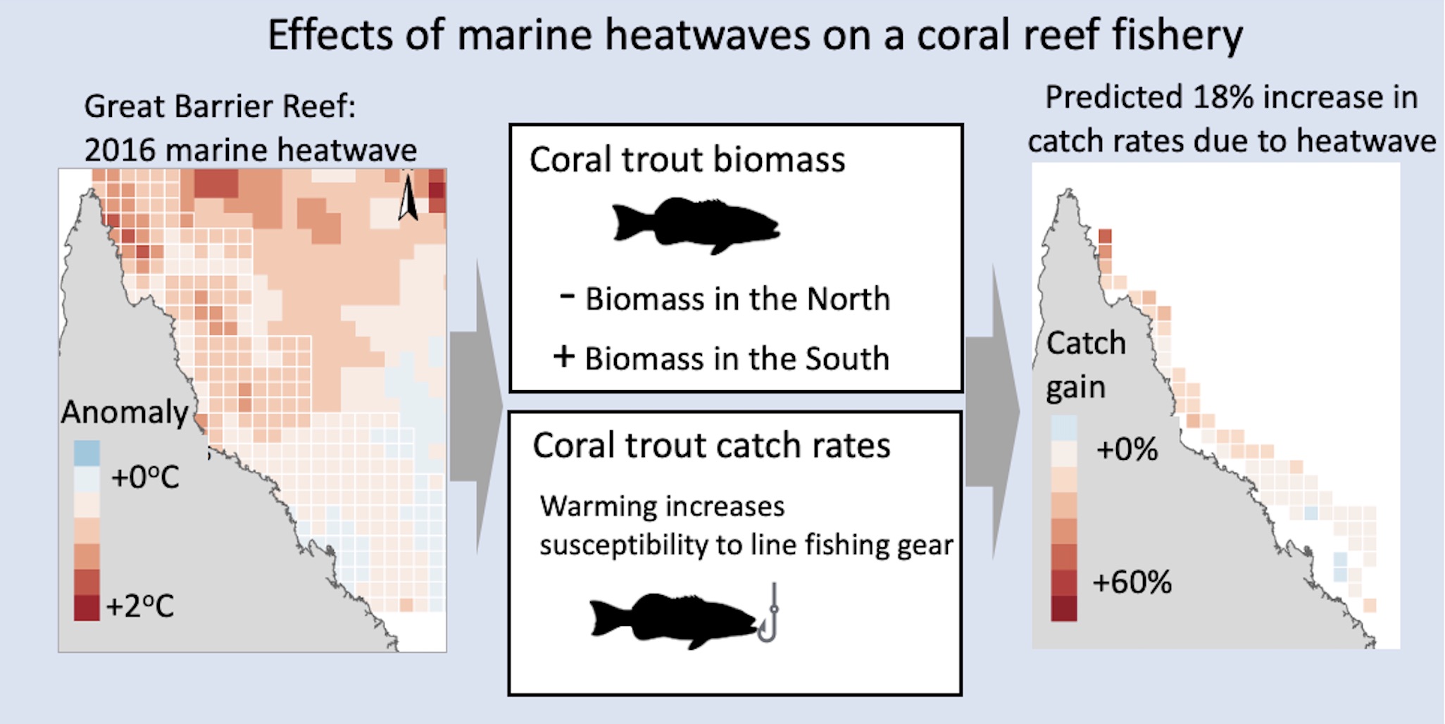 If heatwaves have direct physiological effects on fish communities, they may also how easily fish can be caught in fisheries. We addressed this question for coral trout, the most important commercial finfish taxa on the Great Barrier Reef.