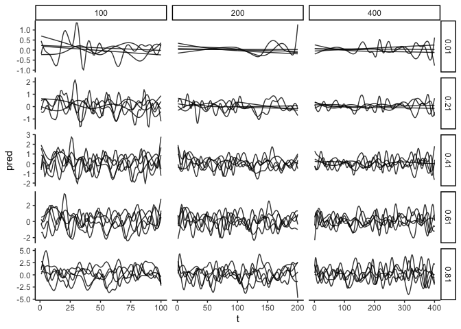 Now bind all those dataframes (nested in a list), so we can plot them with ggplot. Below plot shows every GAM fit for each timeseries length (columns) and each correlation coef (rows).