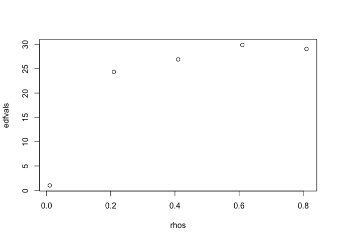 We’ll use a GAM to fit a spline to the data we just simulated. Part of the GAM output is an EDF (Effective Degrees of Freedom) statistic. Higher values = greater non-linearity. We should see higher values of the EDF when the AR is greater (because then we get more strong non-linear deviations from the mean):