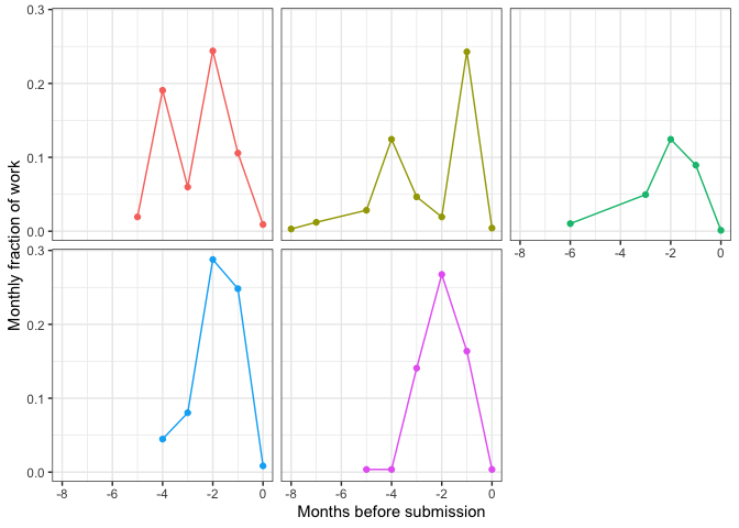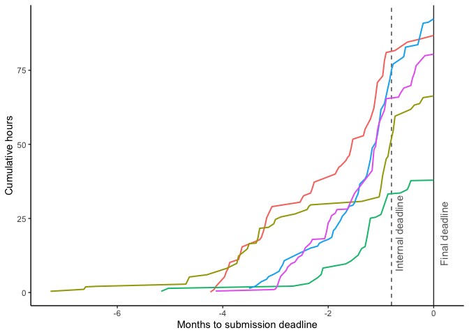 Then effort peaks just before the lead up to the 1 month mark. Most major grants require internal review by the University’s research office, and the deadline for that is 1 month before the final.