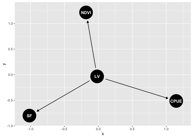 Our observed indicators are SF (streamflow), NDVI (veg greeness) and CPUE (catch per unit effort). LV is a latent variable that represents correlations among the observed variables.