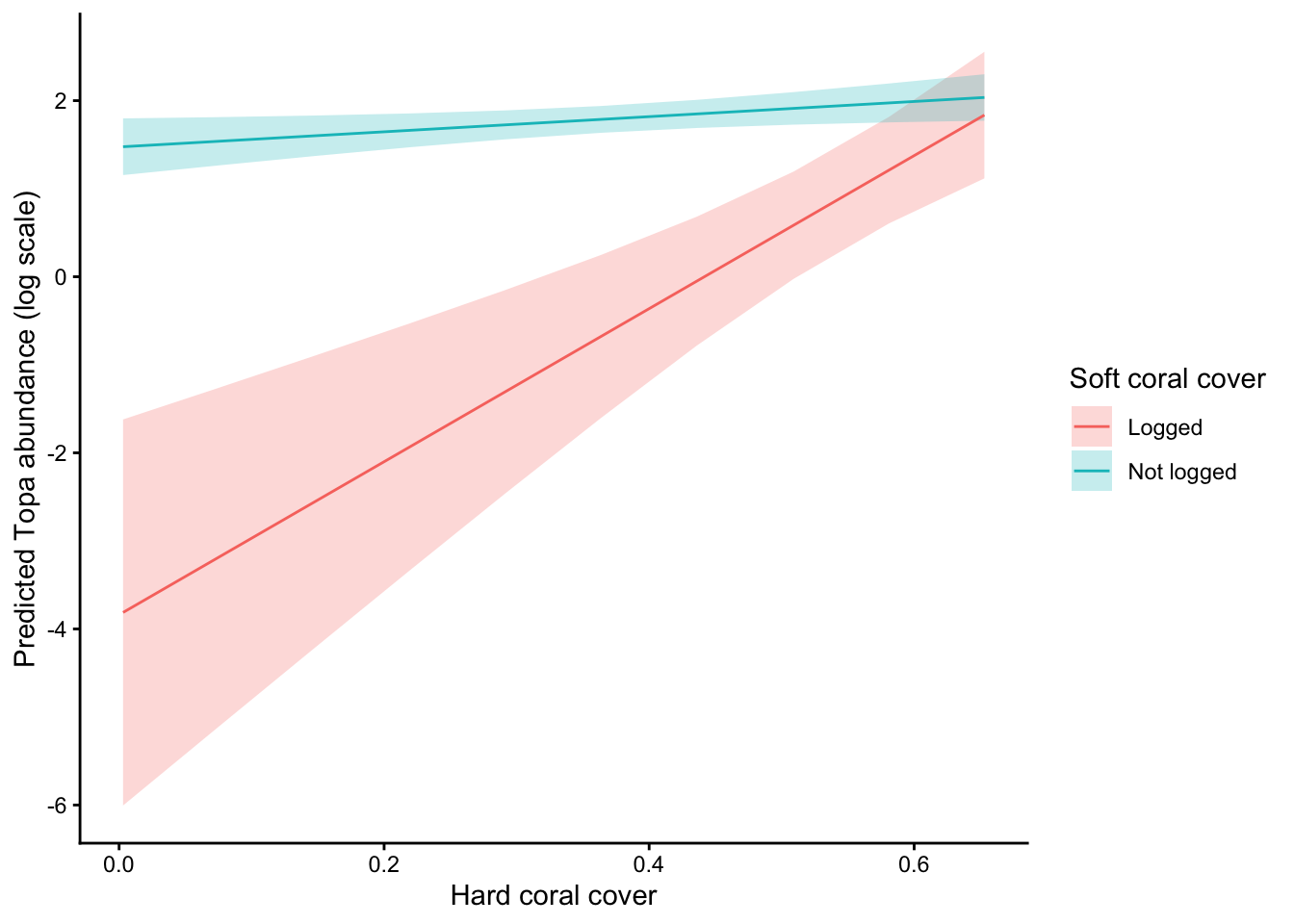 pr <-estimate_means(m1, by =c("cb_cover", "logged"),estimate ="typical",type ="link")plot(pr) +labs(x ="Hard coral cover",y ="Predicted Topa abundance (log scale)",color ="Soft coral cover", fill ="Soft coral cover" ) +theme_classic()