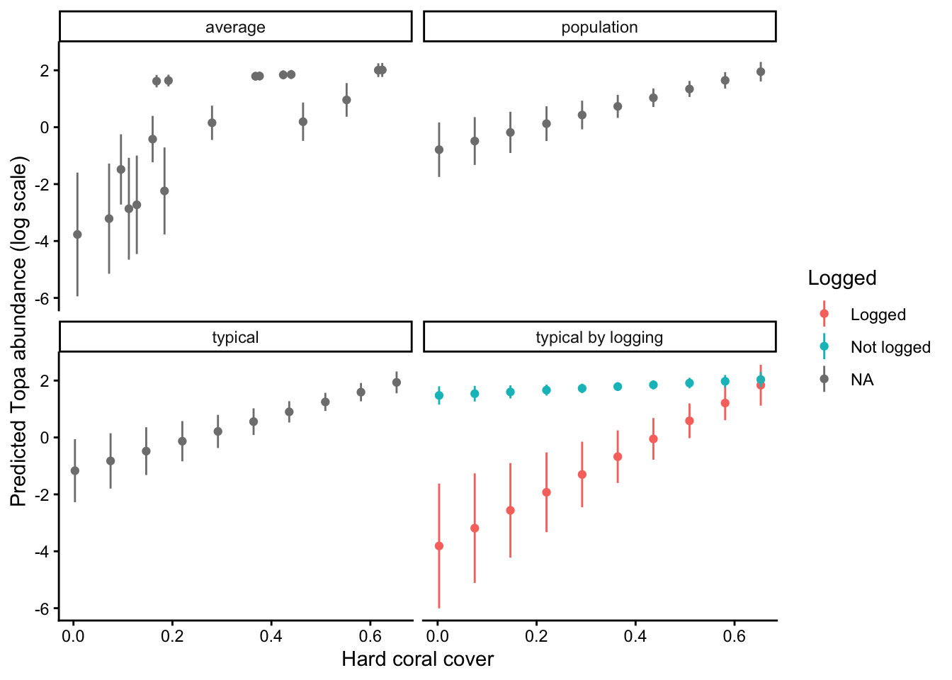 ggplot(pr_all, aes(x = cb_cover, y = Mean, color = logged)) +geom_point() +geom_linerange(aes(ymin = CI_low, ymax = CI_high)) +facet_wrap(~method) +labs(x ="Hard coral cover",y ="Predicted Topa abundance (log scale)",color ="Logged" ) +theme_classic()
