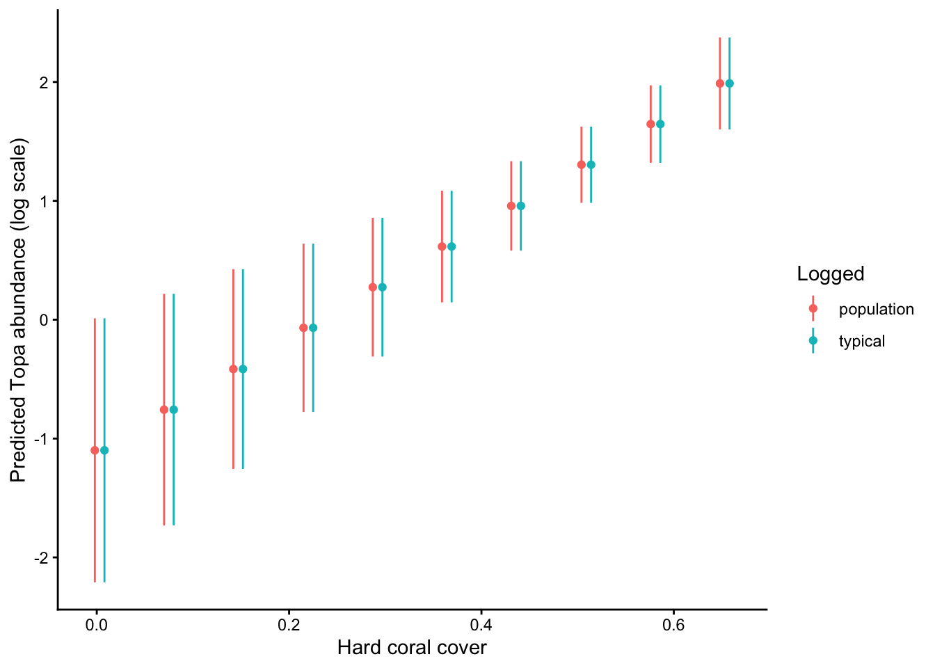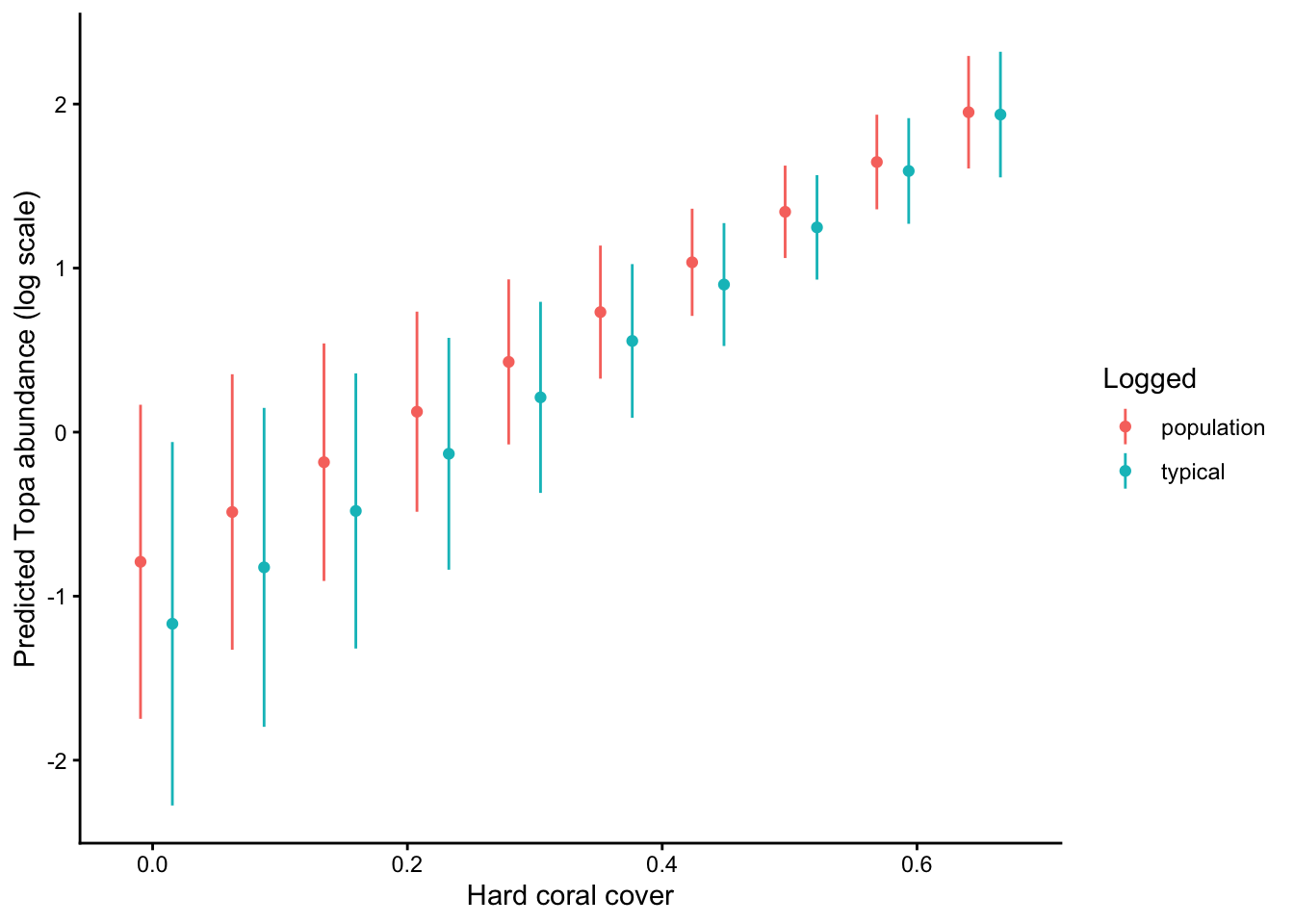pd <-position_dodge(width =0.05)pr_all %>%filter(method %in%c("population", "typical")) %>%ggplot(., aes(x = cb_cover, y = Mean, color = method)) +geom_point(position = pd) +geom_linerange(aes(ymin = CI_low, ymax = CI_high), position = pd) +labs(x ="Hard coral cover",y ="Predicted Topa abundance (log scale)",color ="Logged" ) +theme_classic()