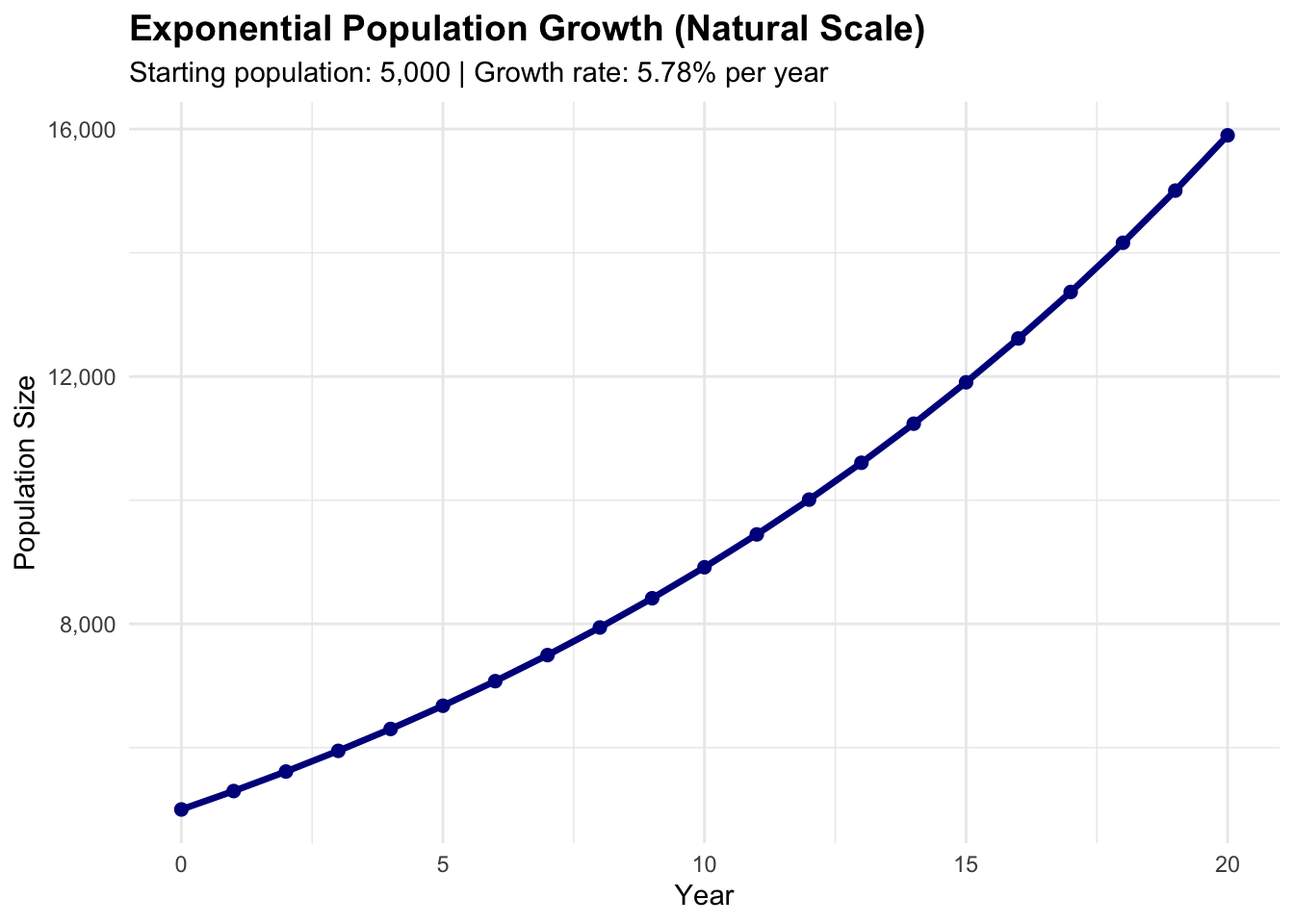 Let’s visualize what this exponential growth rate means by projecting a small population forward in time. We’ll start with 5,000 individuals and see how it grows over 20 years: