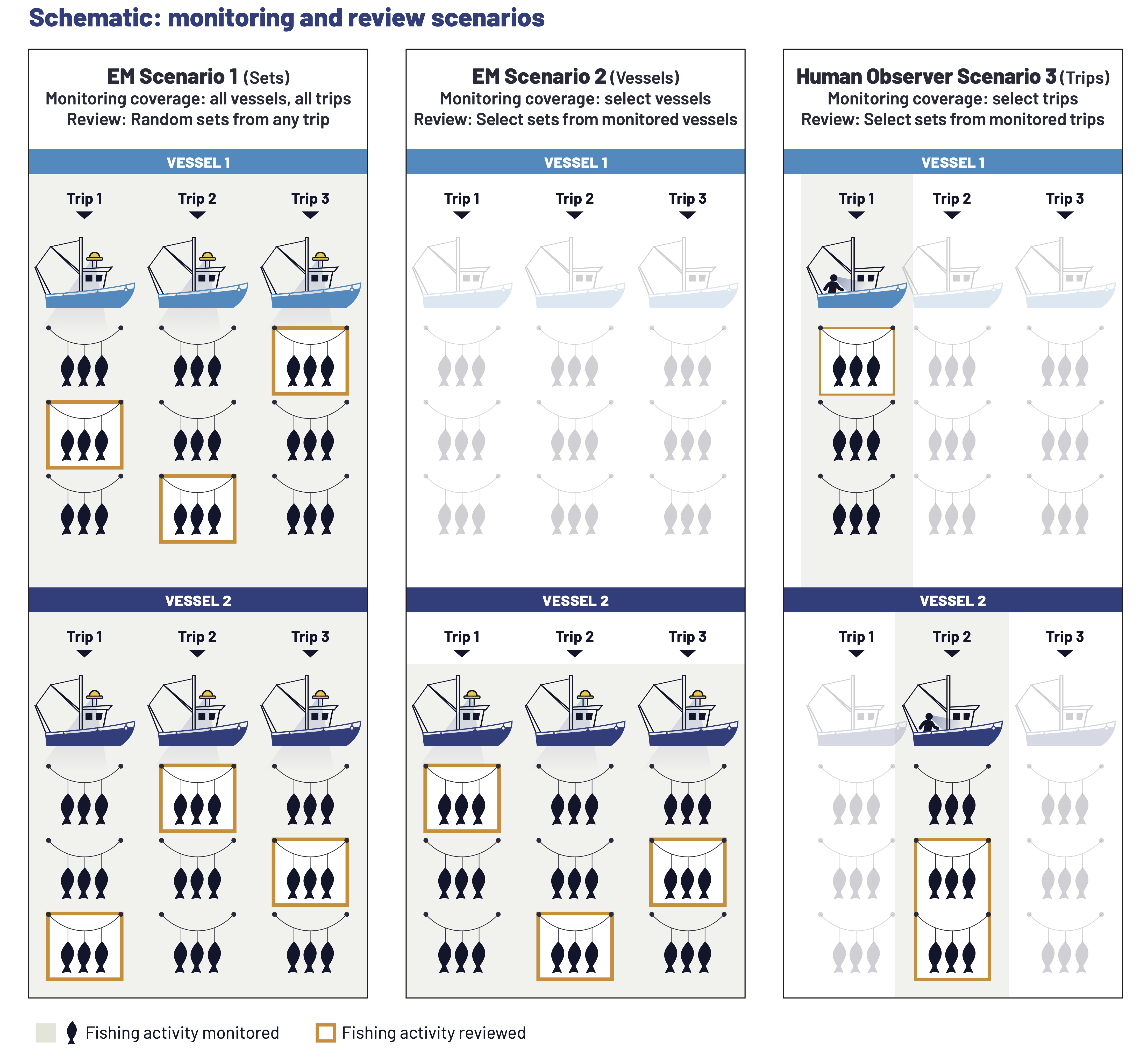 The most reliable data is provided when you have cameras on every vessel, then sample those videos at random. But ‘monitor 30%’ could also be interpreted as 30% of vessels or 30% of fishing trips. The 30% you see might be the best 30% and you miss high bycatch of threatened species in the other 70%, for instance.