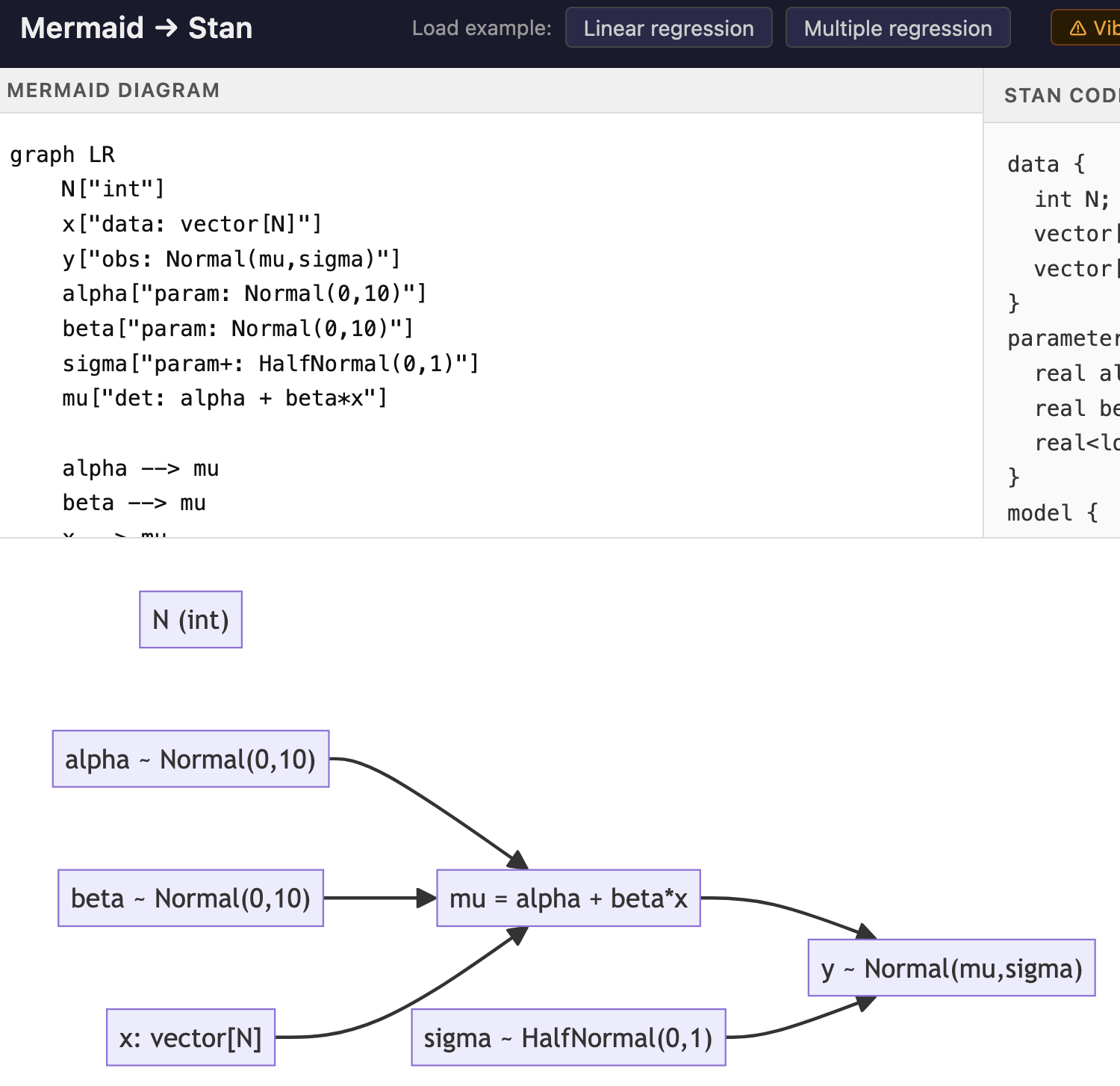 As an example of alternative possibilities, I vibe coded a webpage that takes mermaid syntax (a flow chart syntax) and turns it into a Bayesian model (specifically written in the Stan language). Try a prototype of ‘mermaid to stan’ here.