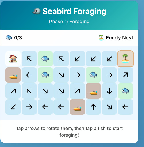 Seabird block game. This ones takes a bit more explaining. But the basic idea is that the player is a seabird and they have to navigate a wind field to catch fish and feed their chick. Meanwhile they are competing for fish with a fishing boat.